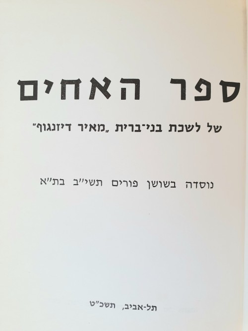 תאור תמונה: שער הספר {ספר האחים - של לשכת בני ברית "מאיר דיזנגוף"}