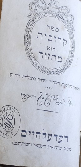 תאור תמונה: שער הספר {ספר קרובות הוא מחזור- סט שלושה מחזורים ליום ראשון ושני של פסח,יום ראשון ושני של ראש השנה,לשמיני עצר}