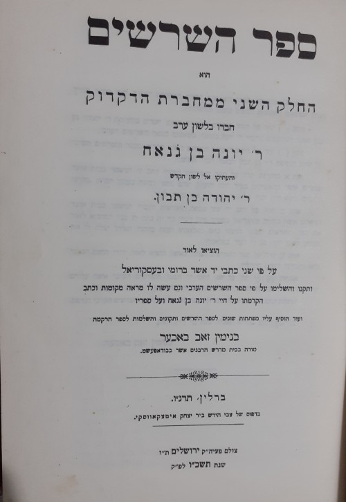 תאור תמונה: שער הספר {ספר השרשים לר' יונה בן ג'נאח}