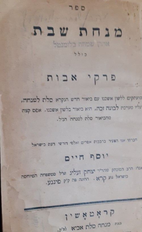 ספר מנחת שבת כולל פרקי אבותיוסף חיים בן הרב יצחק זעליג זצ"ל