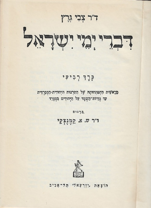 תאור תמונה: שער הספר {דברי ימי ישראל - כרך רביעי : מראשית התפתחותה של התרבות היהודית-הספרדית}